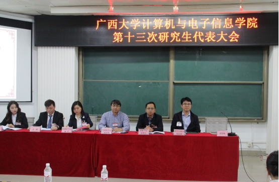 第十三次研究生代表大会在学院214报告厅召开。学院党委副书记邓珍琪老师、学院团委书记莫国志老师、学院团委副书记杨洋老师、学院研究生秘书胡亮青老师、以及学校研究生会代表、各兄弟学院研究生会代表和计电学院研究生代表出席本次会议。