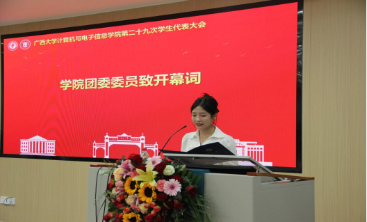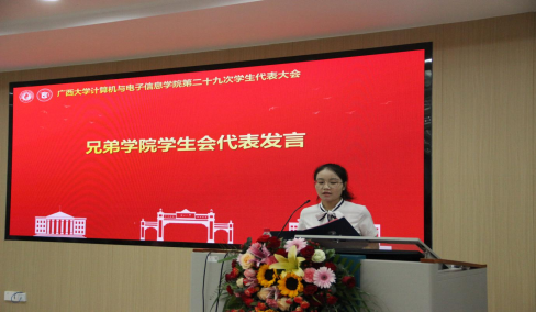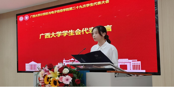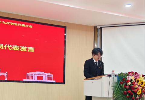 学生会代表黎栗蓉同学发言。她对学院学生会一年以来的工作给予肯定,并希望学院学生会继续坚持从同学中来、到同学中去的工作理念,为不断提升同学的满意度、大局贡献度以及社会认可度不懈努力。