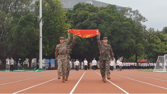 退伍大学生踏着铿锵有力的步伐护送院旗从主席台走过。