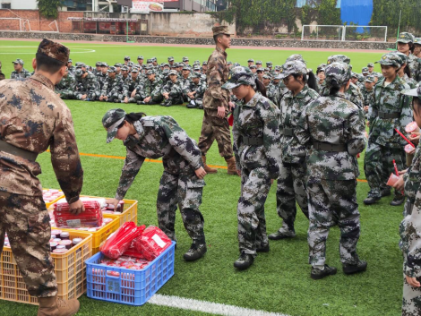 最后,学院领导、老师为教官和同学们分发饮品,表达学院对同学们的诚挚关怀,进一步激发同学们的训练热情,激励同学们在接下来的日子里,以更加饱满的精神状态投入到军训的每一刻。