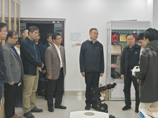 305无人机与机器人图形像与虚拟现实技术物联网技术实验室、中国-柬埔寨智能制造技术联合实验室看望留校师生。韩校长观摩了学生团队正在调试测试的robomaster机甲大师比赛项目——六轴机械臂机器人,该项目是由看漫画