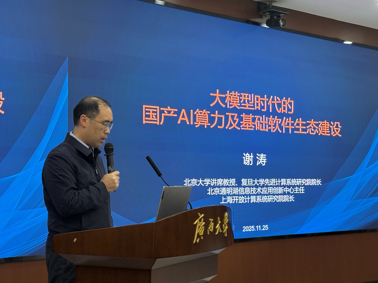 作为广西人工智能战略咨询委员会委员、北京大学计算机学院软件科学与工程系主任,同时身兼复旦大学先进计算系统研究院院长、北京开源芯片研究院首席科学家等多重职务,谢涛院士不仅在 AI 算力与基础软件领域深耕多年,更有着主持国家自然科学基金重大研究计划集成项目等丰富科研经历,曾斩获科学探索奖、国家海外杰青等重磅荣誉。其跨学界与产业界的双重视野,为本次报告赋予了独特的洞察与价值。