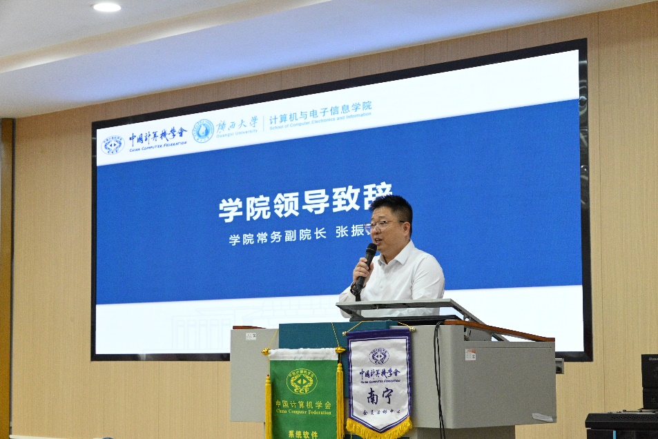 常务副院长张振荣教授致辞。他在致辞中对各位专家的到来表示热烈欢迎,并指出系统软件作为连接硬件与应用的核心枢纽,在人工智能时代面临着新的机遇与挑战,希望通过此次交流,进一步促进学院学科建设与人才培养模式的创新。
