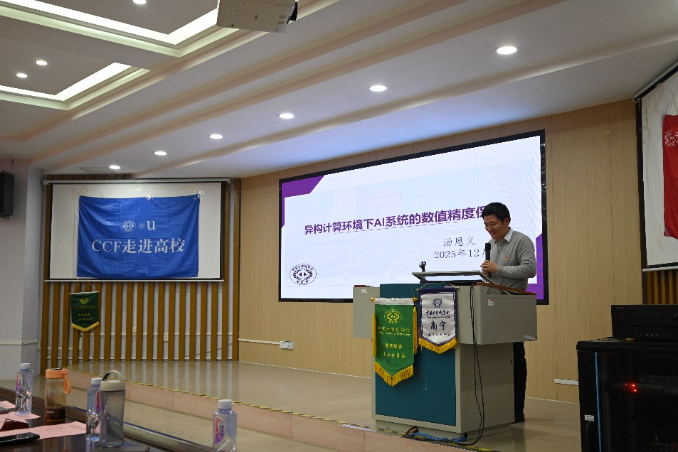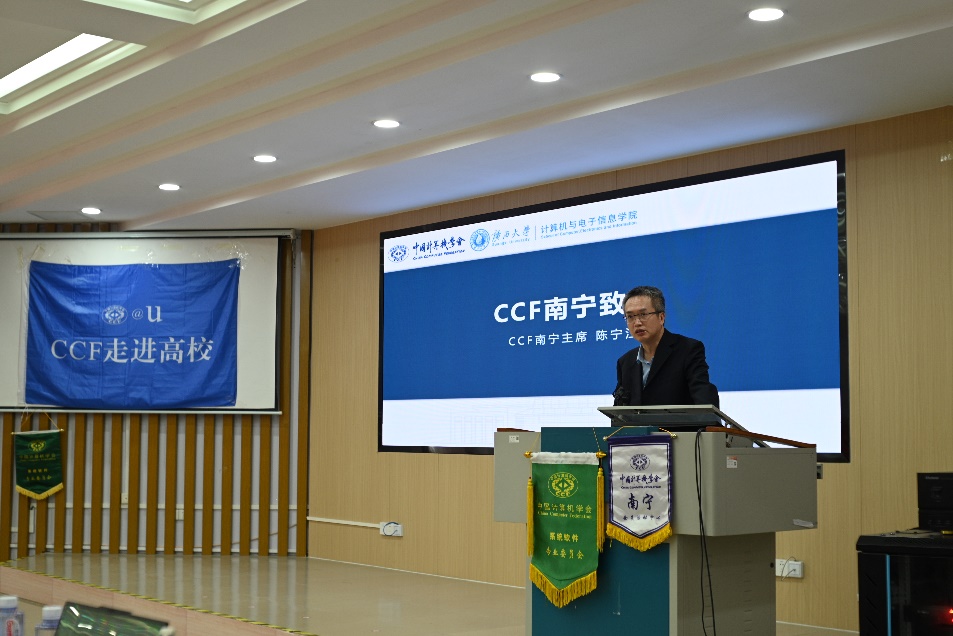 随后,CCF南宁主席陈宁江教授发表致辞。他代表CCF南宁对本次活动的举办表示热烈祝贺,并强调了CCF“走进高校”系列活动在传播前沿科技知识、促进高校与学术界互动方面的重要意义。陈宁江主席表示,期待通过此次高水平的学术研讨,进一步推动广西地区计算机领域的科研合作与资源共享。