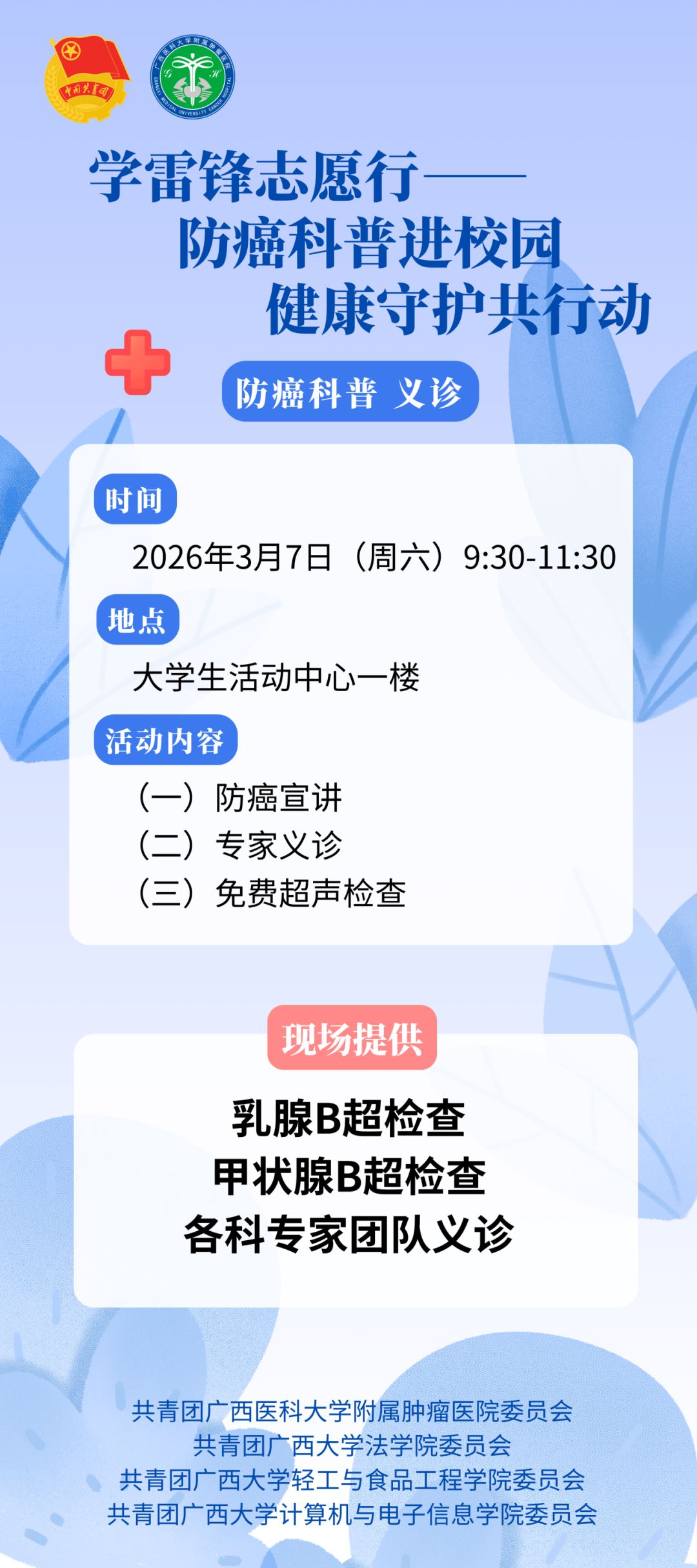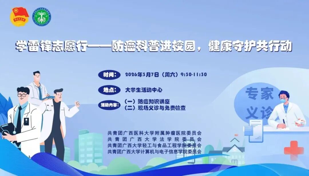 为进一步弘扬雷锋精神,提升大学生健康防护意识,普及癌症防治、食品安全、卫生法律及网络健康信息安全等知识,共青团看漫画 轻工与食品工程学院委员会、共青团看漫画 法学院委员会、共青团看漫画 委员会,联合共青团广西医科大学附属肿瘤医院委员会,将于2026年3月7日开展“学雷锋 志愿行--防癌科普进校园,健康守护共行动”主题公益活动。