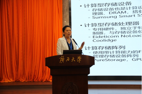 随后,华中科技大学计算机科学与技术学院院长冯丹教授为大家带来了《支持近数据处理的计算型存储技术》主题讲座。冯丹教授首先介绍近数据计算型存储技术的研究现状与进展。随着数据规模增长,数据移动导致的请求延迟增加、系统性能下降、系统整体能效降低等问题越来越严重。为此,数据处理技术成为研究热点。随后,冯丹教授对近数据处理发展趋势做出了权威解读。计算型存储是一种基于近数据处理技术的设备,已应用在数据分析、数据压缩、文件系统、机器学习等应用领域,提升其整体效率。最后,冯丹教授分享了其团队在此领域的探索和一些实践工作,比如如何在分布式的运行存储系统中间,利用存储节点的算力来进行近数据处理,提升整体性能的研究。
