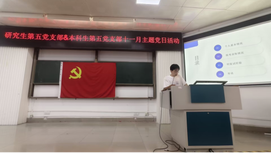 本次主题党日活动分为两个部分进行:一是学院党委专职组织员、本科生第五党支部书记薛金凤同志讲《加强党性修养,做合格的共产党员》专题党课;二是考研经验分享。