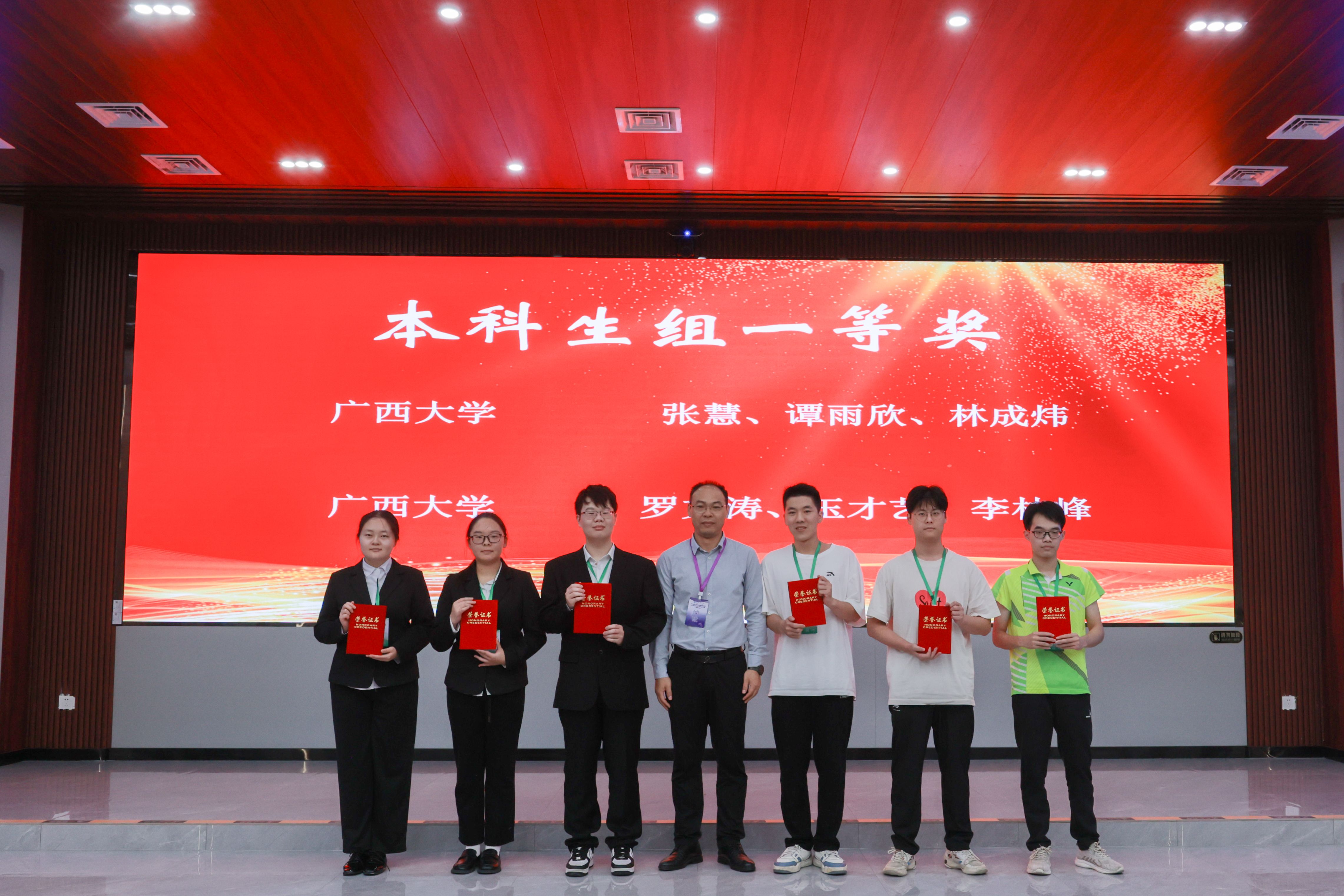 参赛队伍(罗文涛、玉才艺、李林峰,指导老师:黄苡婉、郑羡)凭借扎实的专业功底与出色的创新能力,在激烈角逐中脱颖而出,一举斩获广西赛区一等奖(最高奖项),并获得代表广西参加全国联赛的资格。