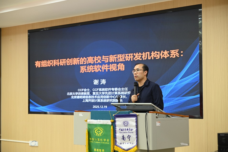 北京大学讲席教授、CCF系统软件专委会主任谢涛教授首先带来了题为《有组织科研创新的高校与新型研发机构体系:系统软件视角》的报告。谢涛教授结合国家创新驱动发展战略,深入分析了高校科研组织当前面临的挑战。